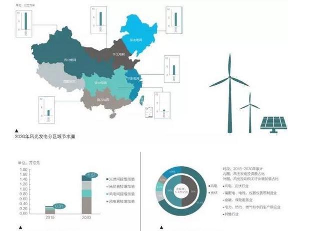 并且中國的煤炭資源和水資源多呈逆向分布。煤炭的開采、洗選和發(fā)電都高度耗水。過度取水給當(dāng)?shù)氐纳鷳B(tài)環(huán)境和人體健康造成了巨大危害。與此相比,風(fēng)光發(fā)電的用水量要小得多。從全生命周期考慮,風(fēng)電和光伏發(fā)一兆瓦時的電力,將比燃煤發(fā)電分別節(jié)約用水2.76立方米和1.63立方米。據(jù)此計算,風(fēng)電和光伏發(fā)電的節(jié)水量將分別從2015年的5.11億立方米、0.62億立方米增長到2030年的27.05億立方米、8.8億立方米,節(jié)約的水資源相當(dāng)于2億人全年的用水需求。