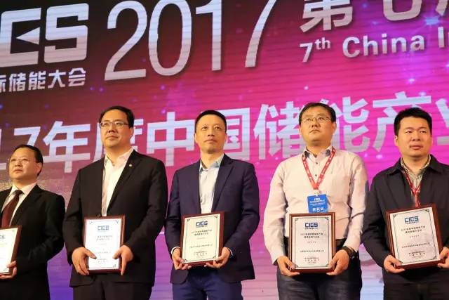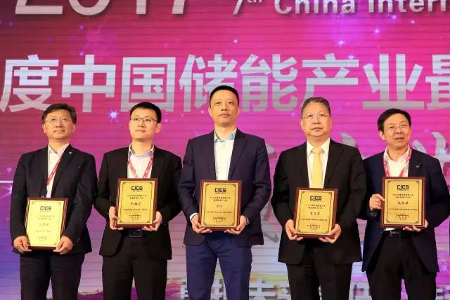 ▲陳博總裁(中)領(lǐng)取“2017年度中國(guó)儲(chǔ)能產(chǎn)業(yè)最具影響力企業(yè)”