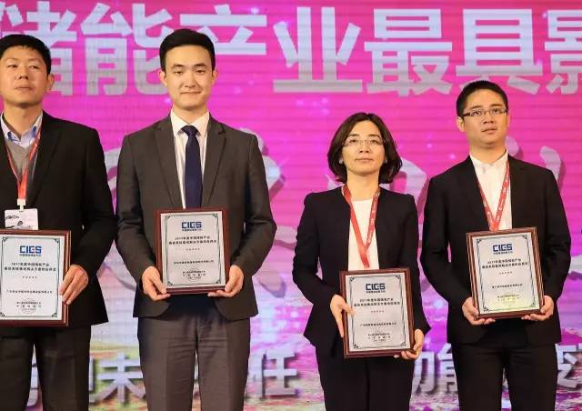 ▲吳賢章總工程師(右二)領(lǐng)取“2017年度中國(guó)儲(chǔ)能產(chǎn)業(yè)最佳通信儲(chǔ)能獎(jiǎng)”