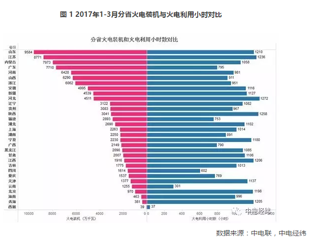 圖 1 2017年1-3月分省火電裝機(jī)與火電利用小時(shí)對(duì)比
