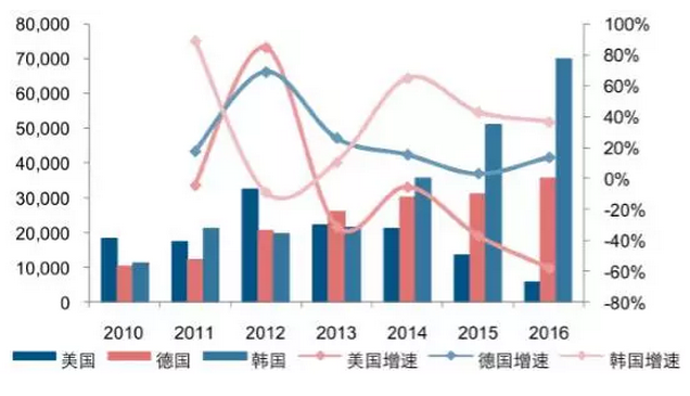 根據(jù)數(shù)據(jù),2016 年我國(guó)多晶硅進(jìn)口 14.1 萬噸,同比增長(zhǎng) 25.67%,進(jìn)口規(guī)模占總消費(fèi)量的 40%以上。其中,從韓國(guó)進(jìn)口 7.01 萬噸,同比增長(zhǎng) 36.92%;從德國(guó)進(jìn)口 3.57萬噸,同比增長(zhǎng) 14.01%。從美國(guó)進(jìn)口 0.56 萬噸,同比減少 56.76%。