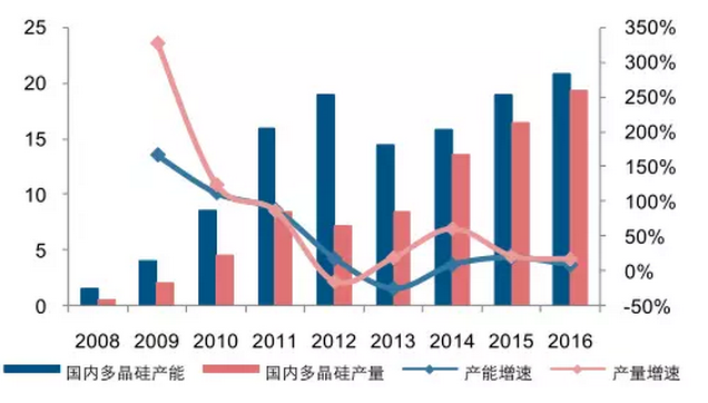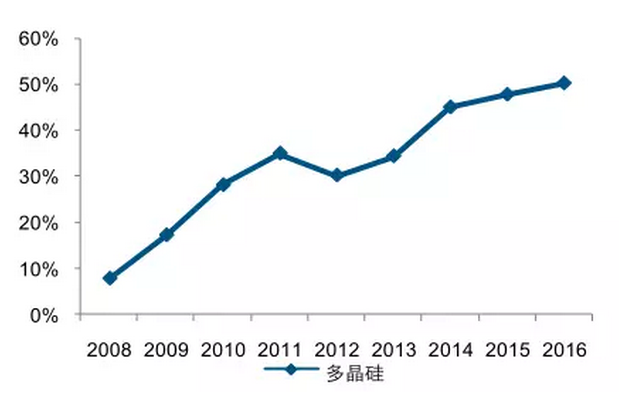 2016 年國(guó)產(chǎn)多晶硅產(chǎn)量在全球的比重也已超過 50%