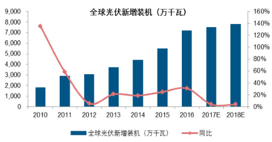 從全球光伏市場需求來看,經(jīng)過前期的市場增長,目前中、日、美光伏裝機需求均逐步進入穩(wěn)態(tài)化發(fā)展,對于全球光伏裝機的增量貢獻逐步減弱。但是,受益于光伏成本的持續(xù)快速下降,光伏發(fā)電在印度、東南亞、南美等地區(qū)的優(yōu)勢逐步顯現(xiàn),多個新興地區(qū)國家陸續(xù)出臺支持光伏發(fā)展的相關(guān)政策,帶動新興市場光伏裝機維持平穩(wěn)增長。整體來看,認(rèn)為后期全球光伏需求仍將維持穩(wěn)定增長趨勢,預(yù)計2017、2018年全球光伏裝機有望達到75、80GW,年化增長5%左右。
