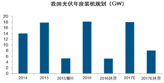 另一方面,隨著光伏扶貧模式逐步清晰、精準(zhǔn)扶貧效果日益顯現(xiàn)等,我國明顯加大對光伏扶貧支持力度,2016年下發(fā)光伏扶貧規(guī)劃約4.5GW,2017年目標(biāo)預(yù)計在8GW左右,光伏扶貧的快速增長同樣將為國內(nèi)光伏行業(yè)裝機提供保證,預(yù)計后期國內(nèi)光伏裝機仍將維持平穩(wěn)發(fā)展趨勢。