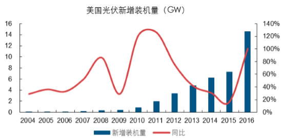 在補貼政策平穩(wěn)的背景下,近年來光伏發(fā)電成本持續(xù)下降,從而使得美國光伏電站投資回報率持續(xù)上行,帶動資金投資意愿上升,而這點將是保證后期美國市場平穩(wěn)增長的根本驅(qū)動力。近年來美國光伏裝機持續(xù)維持快速增長,預(yù)計后期增長趨勢仍將維持。