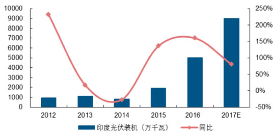 印度市場是后期全球光伏主要的新增市場之一,受益于政策支持,2015年印度實現(xiàn)光伏裝機約2GW。根據(jù)相關(guān)數(shù)據(jù),預(yù)計2016印度裝機將達到4.8GW以上,2017年裝機有望沖擊8-10GW水平。