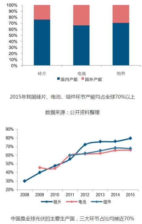 我國作為全球光伏產(chǎn)業(yè)鏈的主要生產(chǎn)國,2006年以來產(chǎn)業(yè)鏈?zhǔn)姓悸食掷m(xù)提升。目前,不管是硅片,還是電池組件,均在全球占據(jù)主力地位。根據(jù)數(shù)據(jù),2015年我國硅片、電池、組件產(chǎn)能占比均超過70%,產(chǎn)量分別占到全球的79.60%、67.72%、66.02%。