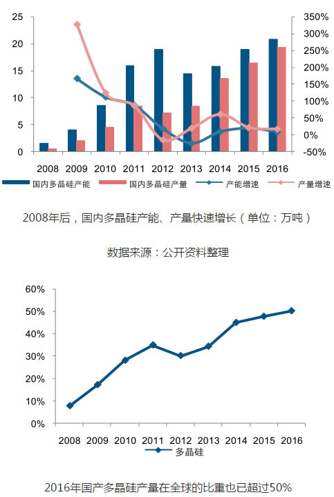 然而,相比于硅片-電池-組件產(chǎn)業(yè)鏈,國內(nèi)多晶硅產(chǎn)業(yè)發(fā)展相對滯后,2008年以前國內(nèi)多晶硅產(chǎn)量占全球產(chǎn)量不足10%,導(dǎo)致國內(nèi)光伏產(chǎn)業(yè)長期受制海外硅料企業(yè)。此后,國內(nèi)企業(yè)開始加速布局多晶硅產(chǎn)能,帶動國內(nèi)多晶硅產(chǎn)量及占比持續(xù)提升,2016年國內(nèi)多晶硅產(chǎn)量19.3萬噸,占世界總產(chǎn)量的50.26%。