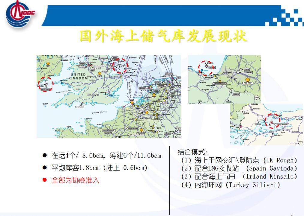 這是歐洲儲氣庫的運行特性,冬天滿足采暖,整個歐洲靠天然氣,雖然歐洲的可再生能源發(fā)展很好,但是它的調(diào)峰目前還是以天然氣為主。這是它的運行機制,包括歐洲和美國的天然氣價格是放開的,求大于供就漲價了,供大于求就降價了。便宜的時候美國四五毛錢一方氣,用不了就存起來,到了冬天天氣很冷的時候,賣到三四塊錢完全有可能,這套體系儲氣庫和管道,包括電網(wǎng)都可以實現(xiàn)盈利,但是價格要放開。這是其他國家的一些海上儲氣庫,因為我們海油主要是從海上的老氣田轉(zhuǎn)儲氣庫?,F(xiàn)在的管道都聯(lián)同了,可以互相互聯(lián)相互串氣。到了冬天如果華北、東北、西北需要采暖的時候,我們和他簽增量合同,完全可以解決。