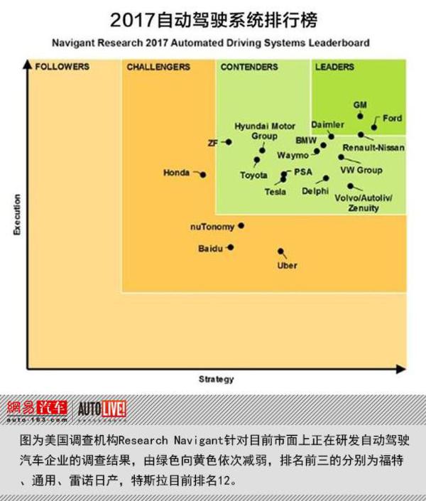 調(diào)查范圍為目前自動駕駛方面領(lǐng)先的18家廠商,包括特斯拉,評定結(jié)果為,它們之間的差距其實很小,排名前三的分別為福特、通用、雷諾日產(chǎn),特斯拉目前排名12.