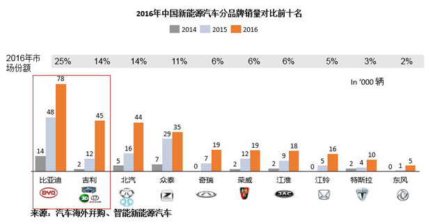 2016年,比亞迪拿下國內(nèi)新能源汽車市場25%的份額,吉利排名第二,市場份額占14%,說這兩家企業(yè)占下國內(nèi)新能源汽車市場的“半壁江山”也并不為過。不妨讓我們細細端量下這兩家土生土長成長起來的本土民族汽車品牌的今日,推斷下他們的明天。