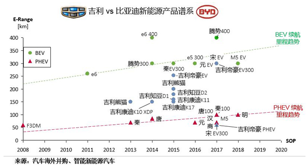 對應(yīng)其各自的新能源戰(zhàn)略,比亞迪和吉利的產(chǎn)品策略都是以純電動為主動,或以純電動為發(fā)展方向。