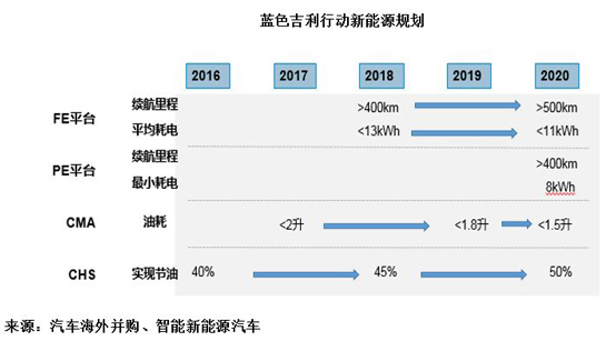 吉利的新能源業(yè)務(wù)也是脫胎于其傳統(tǒng)汽車背景,也是典型的傳統(tǒng)汽車的打法,即汽油、插電式和純電動并舉,先期以傳統(tǒng)汽油車利潤來補貼新能源車的發(fā)展,之后逐漸加大新能源的投入和產(chǎn)出。根據(jù)吉利的藍色行動新能源規(guī)劃,未來三年中,吉利將重點依托純電動(EV)、插電式混動(PHEV)和油電混動(HEV)三條路線(雖然混動不屬于國家定義的新能源汽車),打造中高端純電動汽車FE平臺、小型專屬純電動汽車PE平臺,以及CMA中級車模塊架構(gòu)。將提前實現(xiàn)國家第四階段百公里油耗5L的企業(yè)平均燃油限值的目標,當然這一目標的實現(xiàn)寄希望于與科力遠的混合動力系統(tǒng)合資公司。