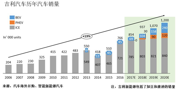 吉利新能源則始終以純電動為主,2013-2015年,主要以“開放”的戰(zhàn)略整合資源,先后與康迪和知豆建立專攻微型電動車的合資公司,生產(chǎn)微型電動車;2015年才推出自己的帝豪EV;2017年上海車展剛剛涉足插電式混合動力,展出了帝豪PHEV。目前吉利新能源的產(chǎn)品結(jié)構(gòu)中,100%是純電動產(chǎn)品。吉利早在2015年發(fā)布的“藍色吉利行動”戰(zhàn)略規(guī)劃中就宣布,到2020年新能源汽車銷量將占公司整體銷量的90%以上。