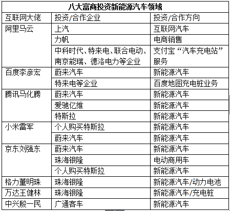 正是看到了這個(gè)巨大“蛋糕”,阿里馬云、百度李彥宏、騰訊馬化騰、小米雷軍、京東劉強(qiáng)東、格力董明珠、萬達(dá)王健林、中興殷一民等八大富商紛紛投資了新能源汽車相關(guān)領(lǐng)域。