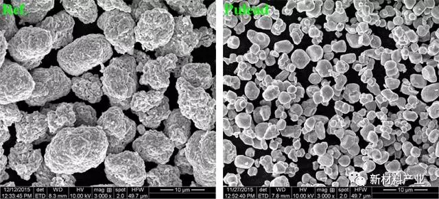 北大先行科技產(chǎn)業(yè)有限公司(以下簡(jiǎn)稱“北大先行”)從調(diào)整材料晶粒尺寸入手,開發(fā)高安全性動(dòng)力三元材料,并取得可喜進(jìn)展。圖2(a)是目前市面常見的團(tuán)聚體形貌三元正極材料,圖2(b)則是該公司通過調(diào)整晶粒尺寸、控制顆粒形貌開發(fā)的新型三元正極材料。