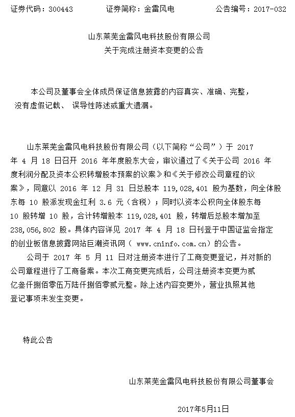 中國儲能網(wǎng)訊:金雷風(fēng)電昨日對注冊資本進(jìn)行了工商變更登記,并對新的公司章程進(jìn)行了工商備案。本次工商變更完成后,金雷風(fēng)電注冊資本由11903萬元變更為23806萬元,具體為貳億叁仟捌佰零伍萬陸仟捌佰零貳元整(238,056,802元)。以下為具體公告: