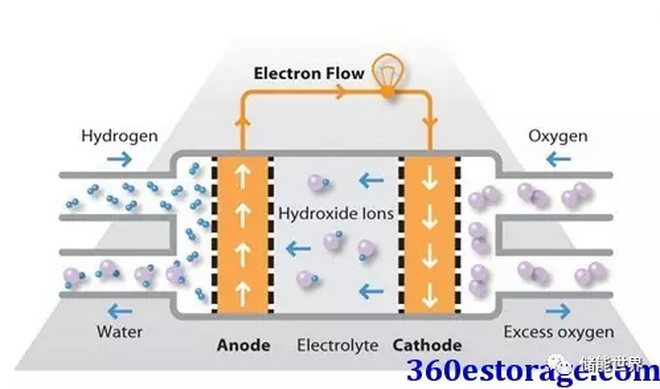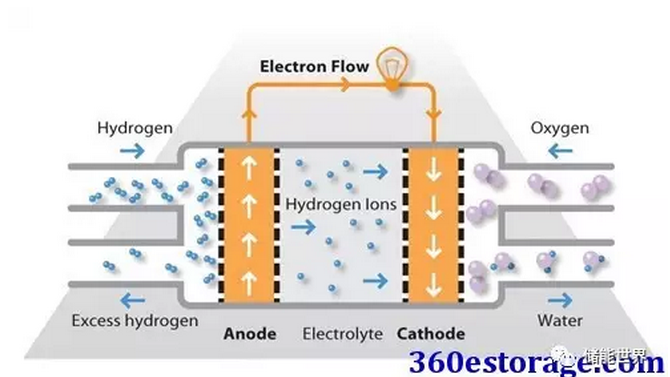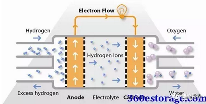 氫燃料在陽(yáng)極處被處理,其中電子與鉑基催化劑的表面上的質(zhì)子分離。質(zhì)子通過(guò)膜到達(dá)電池的陰極側(cè),同時(shí)電子在外部電路中行進(jìn),產(chǎn)生電池的電輸出。在陰極側(cè),另一個(gè)貴金屬電極將質(zhì)子和電子與氧氣結(jié)合以產(chǎn)生水,其作為唯一的廢物排出;氧可以以純化形式提供,或者在電極處直接從空氣中提取。