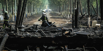 5月2日,經(jīng)濟觀察報記者趕往蟹島時,火災(zāi)現(xiàn)場已經(jīng)被嚴(yán)密封鎖。根據(jù)附近多位居民的說法,5月1日的火災(zāi)很嚴(yán)重,幾公里外可以看見數(shù)十米高沖天的黑煙,中間還伴隨著巨大的爆炸聲,雖然大火在兩個小時內(nèi)得到控制,但是消防車輛直至下午4點還在不斷灑水。從一些目擊者拍攝的現(xiàn)場視頻資料來看,火勢幾乎在幾分鐘內(nèi)就變得不可控制,近三十輛車很快被燒得只剩下車架。