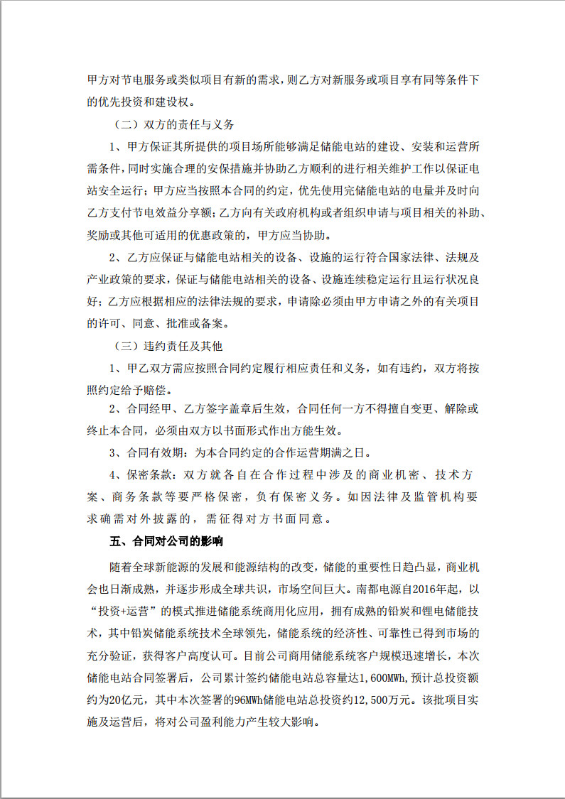 2017年5月18日公告,公司近期分別與無(wú)錫星洲能源發(fā)展有限公司(二期)(以下簡(jiǎn)稱“星洲能源”)、江蘇艾科半導(dǎo)體有限公司(以下簡(jiǎn)稱“艾科半導(dǎo)體”)、江蘇紅豆實(shí)業(yè)股份有限公司(以下簡(jiǎn)稱“紅豆實(shí)業(yè)”)、奧音科技(鎮(zhèn)江)有限公司(以下簡(jiǎn)稱“奧音科技”)簽署針對(duì)實(shí)施電力需求側(cè)管理、改善電能質(zhì)量、有效平抑負(fù)荷波動(dòng)、實(shí)現(xiàn)削峰填谷,以達(dá)到能源節(jié)約利用為目的的儲(chǔ)能電站項(xiàng)目投資服務(wù)合同(以下簡(jiǎn)稱“項(xiàng)目”),合計(jì)容量為96MWh,總投資約12,500萬(wàn)元。