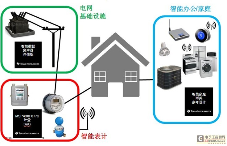 所有這些問題的解決都依賴于半導體技術,德州儀器在整個智能電網建設中提供完整全套的解決方案,從芯片的開發(fā)到解決方案,以及相關軟件和硬件的開發(fā)等。包括智能電網基礎設施(包括集中器、電源監(jiān)控與保護、可再生能源、HV電路斷路器)、智能電表(電表、水表、氣表、熱量表、熱量分配表)、智能家庭及樓宇(物聯(lián)網、IHD/網關、恒溫器、智能家用電器、需求響應單元、電路斷路器、充電電動車輛)。如下圖所示: