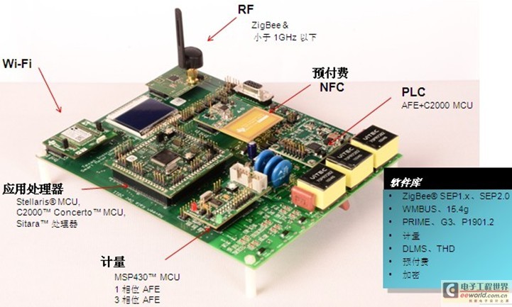 在智能家庭及樓宇應用層面上,TI推出了功能完善的智能儀表評估板解決方案,它集成了最新的通信技術和應用處理器,可以開發(fā)多種針對智能電網的應用。據(jù)James Hao介紹,這是模塊化的評估工具,用戶可以根據(jù)他的實際需要替換其中不同的模塊和部件,比如主處理器,可以用16位、32位的MCU、DSP、ARM處理器以及多核的DSP+ARM處理器完成特定的終端設備核心板的處理。除了核心板,還有不同的通訊模塊,比如Wi-Fi模塊,Zigbee或1GHz以下的通訊模塊,NFC預付費模塊,窄帶PLC電力線載波通訊模塊。在計量方面,根據(jù)客戶的需要,如果需要單相、三相電力線計量模塊可以選用不同的模塊插在板子上完成特定的信號分析和處理。與此同時,TI會提供相關的軟件庫、窄帶PLC通訊軟件協(xié)議棧,同時還有計量、上層DMS,預付加密等相關軟件協(xié)議棧也都會提供給客戶。