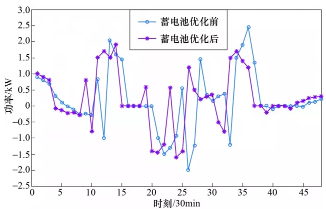 對(duì)比風(fēng)光出力以及核心負(fù)荷運(yùn)行的時(shí)間段,從計(jì)算結(jié)果可以看出:溫控負(fù)荷的運(yùn)行集中在風(fēng)光出力較為充足的時(shí)段或者電價(jià)處于谷時(shí)段和平時(shí)段,但是由于用戶對(duì)負(fù)荷有舒適度的要求,如熱水器和空調(diào),在晚上18:00至22:00之間用電高峰時(shí)段也需要有適當(dāng)集中的運(yùn)行時(shí)間。可轉(zhuǎn)移負(fù)荷中的洗衣機(jī)設(shè)備在優(yōu)化后,運(yùn)行時(shí)間被轉(zhuǎn)移到電價(jià)最為低廉的清晨,且這時(shí)候風(fēng)力發(fā)電相對(duì)充足,符合能量管理策略最初的設(shè)計(jì)期望,對(duì)于電飯鍋的運(yùn)行時(shí)段,也是符合日常生活規(guī)律的,且在一定程度上提前或延遲其運(yùn)行時(shí)段,達(dá)到了優(yōu)化的要求。由圖6可以看出,在負(fù)荷需求量較大的時(shí)段18:00至22:00、14:00至16:00處于負(fù)荷用電高峰時(shí)段,且此時(shí)的電價(jià)也處于峰值階段,蓄電池放電較多,而在負(fù)荷需求量較小的上午且電價(jià)處于谷值時(shí),蓄電池得以充電。并且可以看出優(yōu)化后的蓄電池充放電深度明顯小于優(yōu)化前的充放電深度,因此可以適當(dāng)降低蓄電池的配置容量,從而符合虛擬儲(chǔ)能的優(yōu)化目標(biāo)。