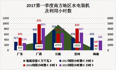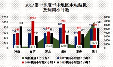 2017年第一季度,全國(guó)水電設(shè)備平均利用小時(shí)數(shù)623小時(shí),同比降低68小時(shí)。水電裝機(jī)容量超過1000萬(wàn)千瓦的7個(gè)省份中,除云南外,其余省份水電設(shè)備平均利用小時(shí)數(shù)同比均有不同程度降低。