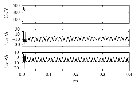 從圖9可知,通過ESU的穩(wěn)壓控制,PSU公共直流側(cè)母線電壓基本上保持為直線,表明了ESU的穩(wěn)壓性能優(yōu)越,可以有效的抑制混合微電網(wǎng)能量的波動。此外,由于儲能電池Bat1的SOC大于儲能電池Bat2的SOC,所以充電電流iL,Bat1要大于iL,Bat2,可以看出仿真結(jié)果和分析結(jié)果一致,驗證了ESU能量協(xié)調(diào)控制方法的有效性。