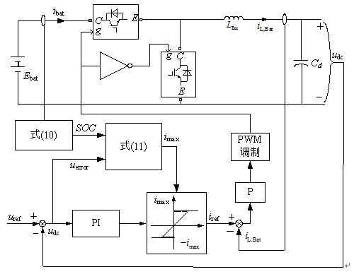 此外,考慮到不同儲能電池在同一時刻的SOC并不一樣,如果都采用同樣的充放電電流,易導(dǎo)致部分電池過度充電或者過度放電,這樣不僅浪費電池容量,還會嚴重影響電池壽命,因此,必須采用合適的控制策略協(xié)調(diào)各ESU的控制。為此,本文提出利用儲能電池的SOC和直流側(cè)母線電壓偏差uerror來協(xié)調(diào)ESU的控制,利用兩者調(diào)節(jié)電流限幅器的限幅幅值,從而實現(xiàn)對不同SOC的儲能電池的充放電速度的協(xié)調(diào)控制。具體控制結(jié)構(gòu)圖如圖5所示,采用電壓電流雙閉環(huán)控制,外環(huán)是電壓控制環(huán),采用PI控制,用以改善系統(tǒng)輸出電壓的波形,使其具有較高的輸出精度;內(nèi)環(huán)是電感電流調(diào)節(jié)環(huán),采用比例P控制,可以提高控制系統(tǒng)的動態(tài)性能。