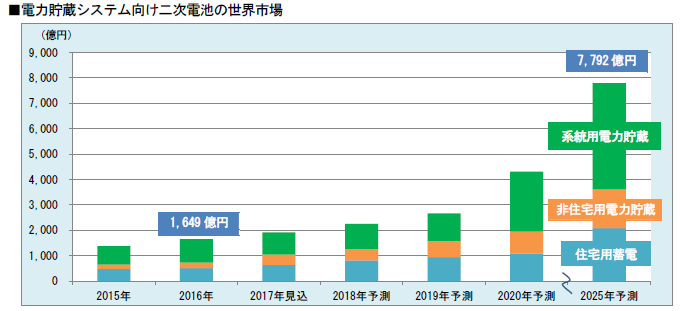 報(bào)告顯示,2016年全球儲(chǔ)能電池市場(chǎng)規(guī)模為1649億日元(約合人民幣101.5億元),其中,鋰離子電池隨著價(jià)格不斷下降,應(yīng)用領(lǐng)域?qū)⒏訌V泛,并逐漸實(shí)現(xiàn)大規(guī)模儲(chǔ)能應(yīng)用。另外,電輔助市場(chǎng)與家用光伏的發(fā)展,以及可再生能源發(fā)電并網(wǎng)規(guī)模攀升也將推動(dòng)鋰離子儲(chǔ)能電池需求進(jìn)一步增長(zhǎng)。