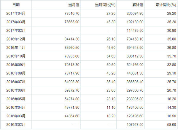 以下為2016年2月至2017年4月我國(guó)鋰離子電池產(chǎn)量。