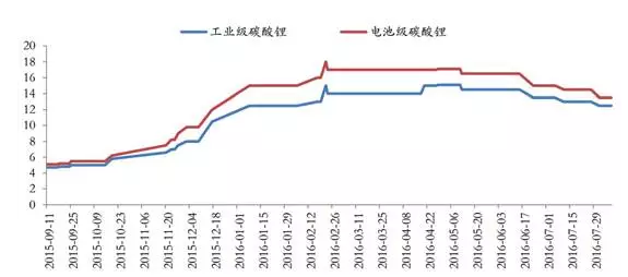 工業(yè)級和電池級碳酸鋰出廠價(jià)走勢圖(單位:萬元/噸)