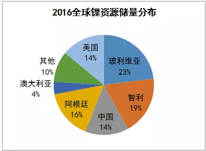 據(jù)美國地質(zhì)調(diào)查局2016年最新統(tǒng)計(jì),世界已查明的鋰資源量約4099萬噸,儲量約1400萬噸。從分布來看,主要分布在南美洲和亞洲(約70%),重要富集地為南美洲“鋰三角”(玻利維亞、阿根廷、智利)。