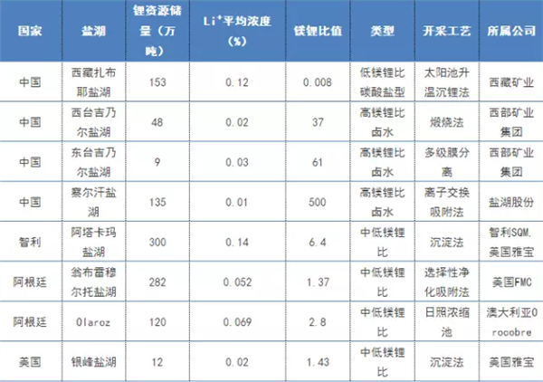 西藏礦業(yè)、西部礦業(yè)集團(tuán)、鹽湖股份、SQM、FMC和美國雅寶等公司掌握著全球著名的鹽湖,不同鹽湖,鎂鋰比值也有很大的差別,運(yùn)用的開采工藝也會“因湖而異”。下表是全球已開發(fā)的著名鹽湖提鋰技術(shù)。