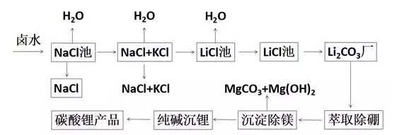 (1)鹽湖提鋰,主要是利用太陽能將含鋰鹵水在蒸發(fā)池中自然蒸發(fā)、濃縮,析出碳酸鋰。