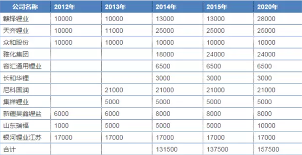 國內(nèi)外鋰業(yè)公司主要有鹽湖股份、中信國安、西部礦業(yè)、西藏城投、贛鋒鋰業(yè)、天齊鋰業(yè)、海門容匯通用、江特電機(jī)、融捷股份、眾和股份、SQM、FMC、Albemarle(Rockwood)、Orocobre、Talison和RBEnery。下表為這14家企業(yè)的鋰產(chǎn)能。
