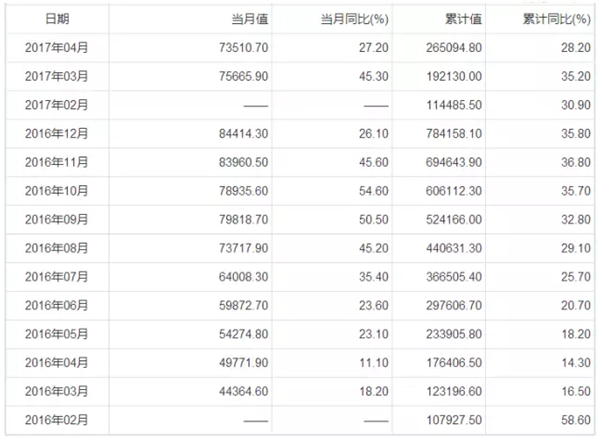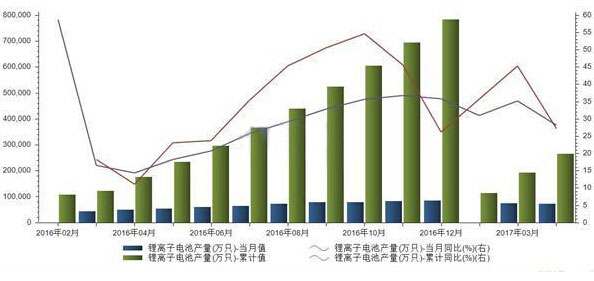 以下為2016年2月至2017年4月我國鋰離子電池產(chǎn)量: