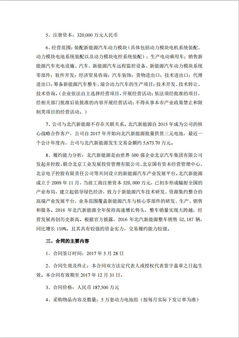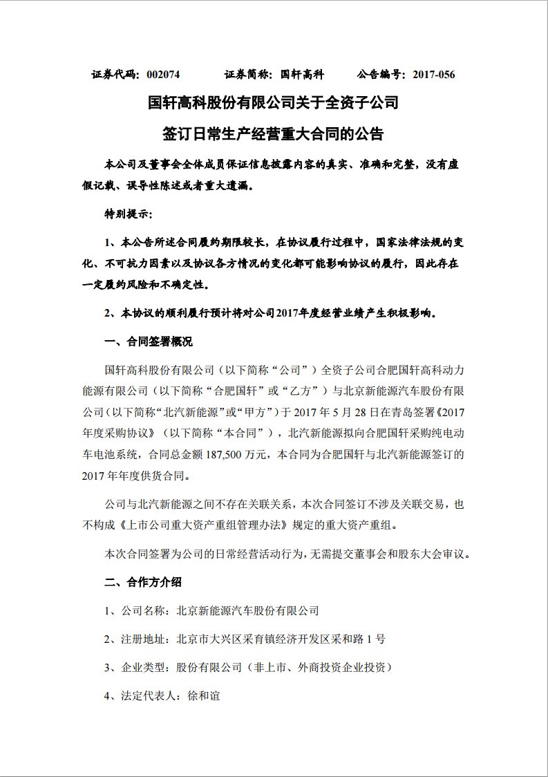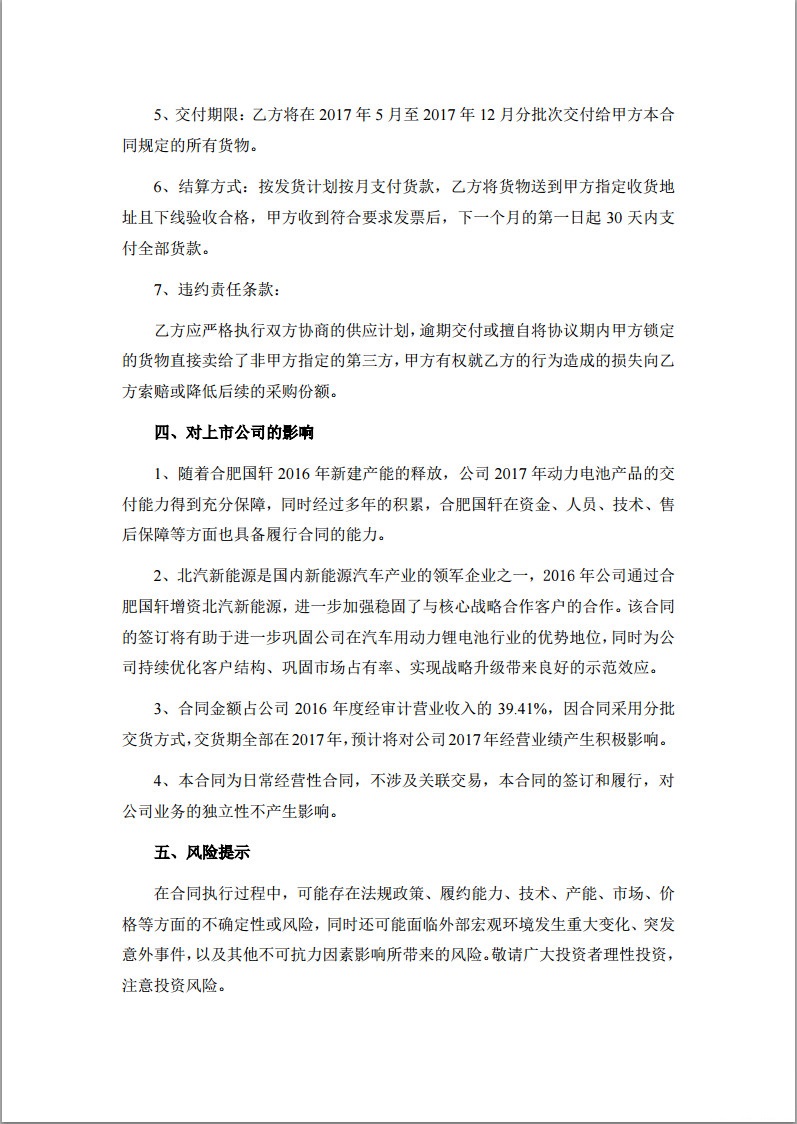 中國(guó)儲(chǔ)能網(wǎng)訊:國(guó)軒高科5月31日發(fā)布公告稱(chēng),國(guó)軒高科股份有限公司全資子公司合肥國(guó)軒高科動(dòng)力能源有限公司與北京新能源汽車(chē)股份有限公司于2017年5月28日在青島簽署《2017年度采購(gòu)協(xié)議》,北汽新能源擬向合肥國(guó)軒采購(gòu)純電動(dòng)車(chē)電池系統(tǒng),合同總金額187,500萬(wàn)元,該合同為合肥國(guó)軒與北汽新能源簽訂的2017年年度供貨合同。