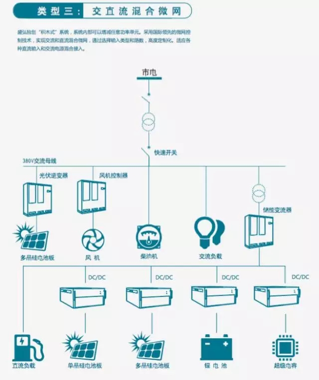 自2012年以來,盛弘電氣儲能PCS已積累了多個微電網(wǎng)項目應(yīng)用經(jīng)驗,并形成了針對不同類型微電網(wǎng)的解決方案,包括交流微電網(wǎng)、直流微電網(wǎng)及交直流混合微電網(wǎng)。這種解決方案上的廣泛覆蓋性首先源于產(chǎn)品模塊化設(shè)計所帶來的靈活性,就像搭建積木一樣,針對儲能項目的具體需求,僅通過內(nèi)部功率模塊的增減,盛弘電氣PCS就能適配幾乎所有應(yīng)用場景。