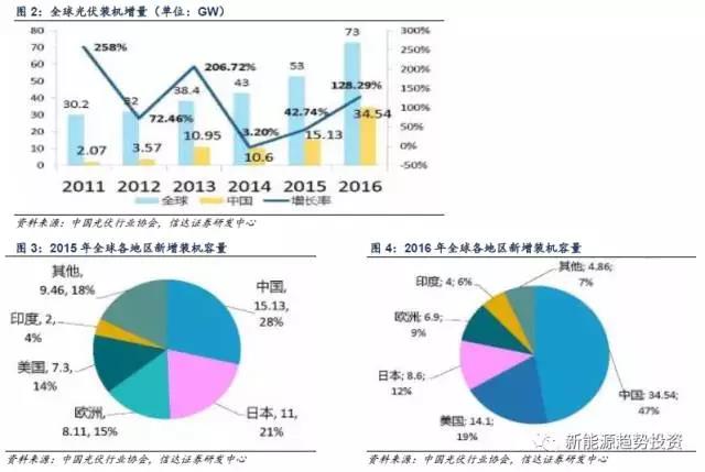 光伏市場(chǎng)空間仍很大,但增速將趨緩。2016年,光伏全年發(fā)電量達(dá)到662億千瓦時(shí),占總發(fā)電量的1.1%,比2015年增加0.43個(gè)百分點(diǎn),比2013年增加0.95個(gè)百分點(diǎn)??梢?jiàn)我國(guó)光伏發(fā)電比重在不斷上升。2013年-2016年,我國(guó)電力能源結(jié)構(gòu)發(fā)生了較大的變化,火力發(fā)電量所占比重下降了7%。根據(jù)《可再生能源發(fā)展“十三五”規(guī)劃》,到2020年,非化石能源占一次能源消費(fèi)比重的15%;到2030年,非化石能源占一次能源消費(fèi)比重的20%。為達(dá)成此目標(biāo),我們預(yù)計(jì)火力發(fā)電所占比例將進(jìn)一步下降,太陽(yáng)能等清潔能源發(fā)電所占比例將不斷提高,這意味著中國(guó)光伏產(chǎn)業(yè)仍有較大的空間。另一方面,2016年底,國(guó)家能源局發(fā)布了《太陽(yáng)能發(fā)展十三五規(guī)劃》,規(guī)劃中指出了未來(lái)幾年太陽(yáng)能發(fā)展方向?!兑?guī)劃》中提出了到2020年光伏發(fā)電電價(jià)水平在2015年基礎(chǔ)上下降50%以上,在用電側(cè)實(shí)現(xiàn)平價(jià)上網(wǎng)的目標(biāo),這意味著光伏行業(yè)降本壓力比較大。目前光伏行業(yè)降本已進(jìn)入關(guān)鍵期,再加上棄光限電等問(wèn)題急需解決,我們預(yù)計(jì)未來(lái)很難再出現(xiàn)裝機(jī)容量爆發(fā)性增長(zhǎng)的情況,增長(zhǎng)速度將會(huì)趨于平緩。