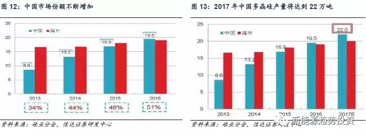 多晶硅行業(yè)進(jìn)口替代空間仍大。相對(duì)于“硅片-電池-組件”產(chǎn)業(yè)鏈來(lái)說(shuō),國(guó)內(nèi)多晶硅產(chǎn)業(yè)發(fā)展相對(duì)滯后,光伏行業(yè)發(fā)展前期,國(guó)內(nèi)多晶硅產(chǎn)量在全世界的占比不超過(guò)10%,導(dǎo)致國(guó)內(nèi)光伏企業(yè)長(zhǎng)期受制于海外硅料企業(yè)。后來(lái),國(guó)內(nèi)企業(yè)開(kāi)始逐漸布局多晶硅產(chǎn)能,國(guó)內(nèi)的多晶硅產(chǎn)量也不斷提高,2016年,國(guó)內(nèi)多晶硅產(chǎn)量為19.5萬(wàn)噸,在全世界多晶硅產(chǎn)量中占50.3%。隨著近幾年國(guó)內(nèi)光伏行業(yè)的快速發(fā)展,中國(guó)多晶硅產(chǎn)量在世界總產(chǎn)量的份額在不斷增加。從2013年的34%已經(jīng)提升到了2016年的51%。我們預(yù)計(jì)未來(lái)中國(guó)市場(chǎng)份額將會(huì)進(jìn)一步提升,根據(jù)中國(guó)有色金屬工業(yè)協(xié)會(huì)硅業(yè)分會(huì)統(tǒng)計(jì),截止 2017 年 2 月底,國(guó)內(nèi)在產(chǎn)多晶硅企業(yè)為 17 家,有效產(chǎn)能共計(jì) 22 萬(wàn)噸/年,較 2016 年底凈增 1 萬(wàn)噸/年,主要來(lái)自新特能源、洛陽(yáng)中硅等技術(shù)改造擴(kuò)產(chǎn)和優(yōu)化產(chǎn)能釋放。根據(jù)其他多晶硅生產(chǎn)企業(yè)的擴(kuò)產(chǎn)進(jìn)度來(lái)看,我們預(yù)計(jì),截止2017年中,國(guó)內(nèi)多晶硅年產(chǎn)能將達(dá)到 25 萬(wàn)噸/年左右。