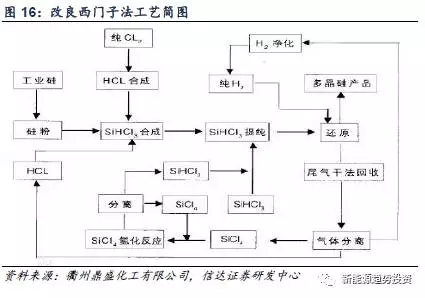 目前生產(chǎn)多晶硅的主要方法是改良西門子法,原理是在1100℃左右的高純硅芯上用高純氫還原高純?nèi)葰涔?,生成多晶硅沉積在硅芯上。改良西門子法,顧名思義,就是在傳統(tǒng)的西門子法上進(jìn)行的改進(jìn),與傳統(tǒng)的西門子法相比,改良西門子法在生產(chǎn)過(guò)程中能耗較少,減少污染,同時(shí)還可以回收利用生產(chǎn)過(guò)程中伴隨產(chǎn)生的大量氫氣、氯化氫、氯化硅等副產(chǎn)品。改良西門子法是目前生產(chǎn)多晶硅最為成熟、最可靠、投產(chǎn)速度最快的工藝,其他工藝很難在短期內(nèi)取代其地位。