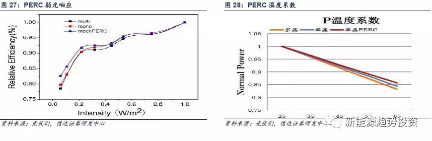 PERC不僅相比常規(guī)電池提升效率,另外在低輻照度條件下PERC電池弱光響應(yīng)優(yōu)于常規(guī)電池,其溫度系數(shù)也優(yōu)于常規(guī),相同條件下,系統(tǒng)具有更高的發(fā)電量。