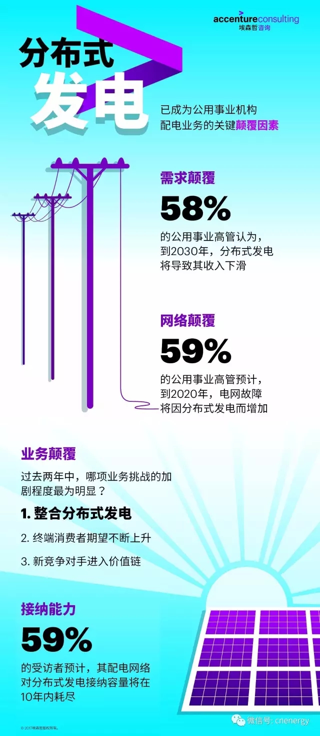 埃森哲大中華區(qū)電力行業(yè)董事總經(jīng)理王靖表示:“隨著民用太陽能等技術(shù)快速演進(jìn),更經(jīng)濟(jì)、更環(huán)保的分布式發(fā)電將更受市場歡迎。光伏與電池儲能、需求響應(yīng)等更具經(jīng)濟(jì)效益的能源解決方案相結(jié)合,會讓能源用戶擁有更大話語權(quán),要求配電公司提供更多不同類型的個性化服務(wù)。提供輸配電服務(wù)的公用事業(yè)機(jī)構(gòu)不能再‘以不變應(yīng)萬變’,而必須采用基于服務(wù)的靈活商業(yè)模式,才能開辟新的收入來源?!?