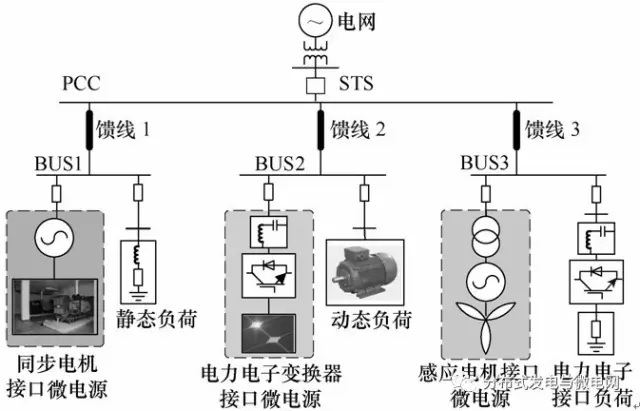 圖1給出了一個(gè)典型的微電網(wǎng)系統(tǒng)框圖,系統(tǒng)代表了不同類型的微電源和負(fù)荷形式的整合。微電源類型、負(fù)荷、網(wǎng)絡(luò)拓?fù)鋮?shù)、控制架構(gòu)隨著不同的應(yīng)用場(chǎng)合、需求和實(shí)際條件而變化。