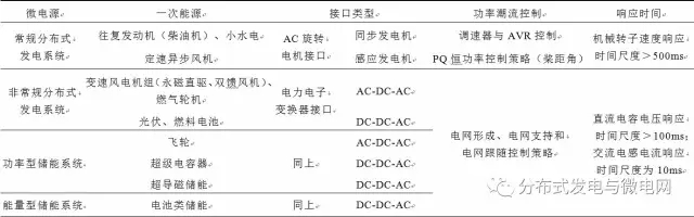 分布式發(fā)電技術(shù)的差異化使得各種分布式電源具有不同的動(dòng)態(tài)特性。表1歸納了典型的用于微電源(包括分布式發(fā)電系統(tǒng)和分布式儲(chǔ)能系統(tǒng))并入微電網(wǎng)的接口變換配置和對(duì)應(yīng)的功率潮流控制方法。
