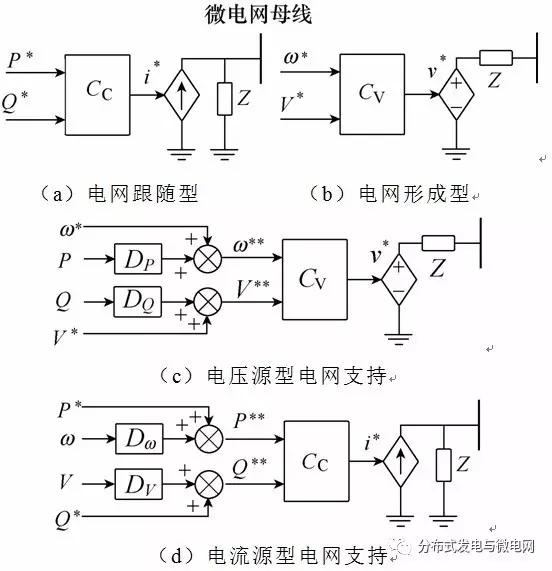 電網(wǎng)形成型電力電子變換器可作為微電網(wǎng)主電源控制,提供微電網(wǎng)電壓和頻率參考,該類變換器能夠用并網(wǎng)的具有低輸出阻抗的理想電壓源等效。此外,電網(wǎng)支持型變換器可細(xì)分為電壓源型和電流源型,可分別用理想電壓源串聯(lián)輸出阻抗和理想可控電流源并聯(lián)輸出阻抗等效表示;該類變換器能夠通過(guò)調(diào)整輸出功率直接或間接地參與微電網(wǎng)電壓和頻率調(diào)整。