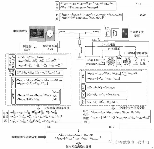 除少數(shù)直接并網(wǎng)的分布式電源外,大部分分布式發(fā)電通過(guò)電力電子變換器并網(wǎng)。因此分布式發(fā)電系統(tǒng)是一個(gè)由一次能源、電力電子變換器和控制系統(tǒng)等環(huán)節(jié)相互耦合的強(qiáng)非線性系統(tǒng),其輸出動(dòng)態(tài)特性是各單元在多個(gè)時(shí)間尺度上特性的疊加[17]。