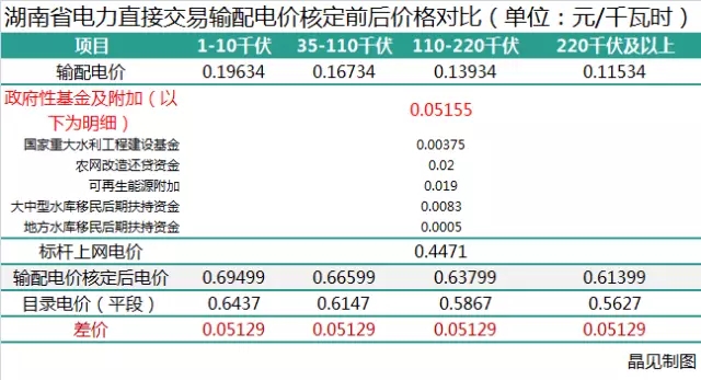 湖南省發(fā)改委于2017年1月1日便開始執(zhí)行輸配電價核定后的銷售電價。晶見計算得出,如果依據(jù)湖南省發(fā)改委關(guān)于省電網(wǎng)2017-2019年輸配電價有關(guān)問題中通知及其附件內(nèi)提到的“參與電力市場的用戶購電價格由市場交易價格、輸配電價(含線損和交叉補(bǔ)貼)和政府性基金組成;未參與電力市場的用戶,執(zhí)行政府規(guī)定的電價”,參與直接交易的電力用戶或者售電公司就需要繳納比目錄電價更高昂的電費(fèi),差價將達(dá)到5.1分。